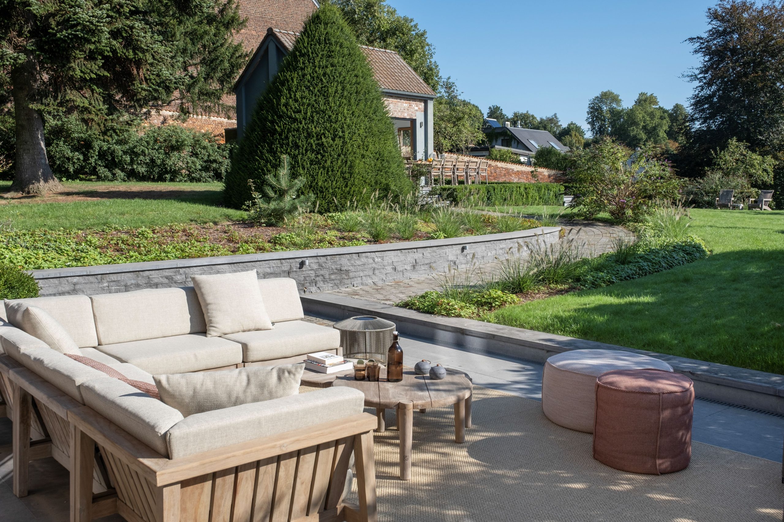 De rode draad die door de verschillende terrassen liep, stelde ons in staat om een harmonieus, vriendelijk en warm geheel te creëren. De klanten vonden het vleugje rustiek waarnaar ze op zoek waren, waardoor hun exterieur een ontspannen setting kreeg. Al het meubilair voor dit project komt van Gommaire, de poefs van Manutti, de lampen van Vincent Sheppard en de tapijten van Limited Edition.