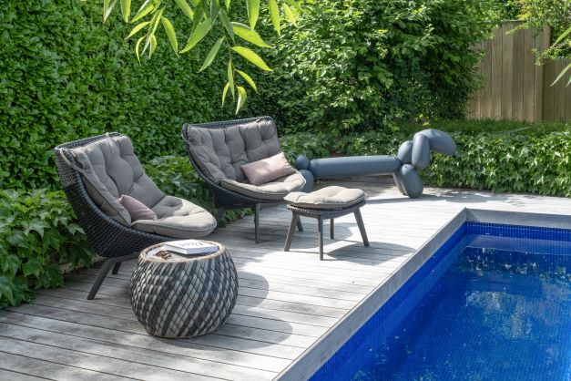 In plaats van de klassieke ligstoelen rond het zwembad stelden we voor om te kiezen voor een buitenlounge met een kleurrijke stof, die veelzijdiger en gezelliger is en die de tinten van de tegels van het boograam en de kleur van de raamkozijnen in het zwartgeblakerde teakhout van het meubilair weerspiegelt.