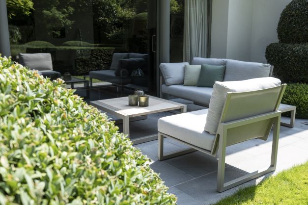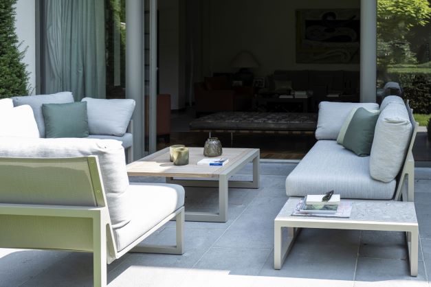 De bestaande klassieke teakhouten tuinmeubelen vernieuwen met meer eigentijdse, tijdloze meubelen die passen bij hun neoklassieke huis dat meer dan 20 jaar geleden werd ontworpen door architect Marc Corbiau. Dit was het verzoek van de eigenaars, een koppel waarvan de kinderen enkele jaren geleden het nest hebben verlaten.