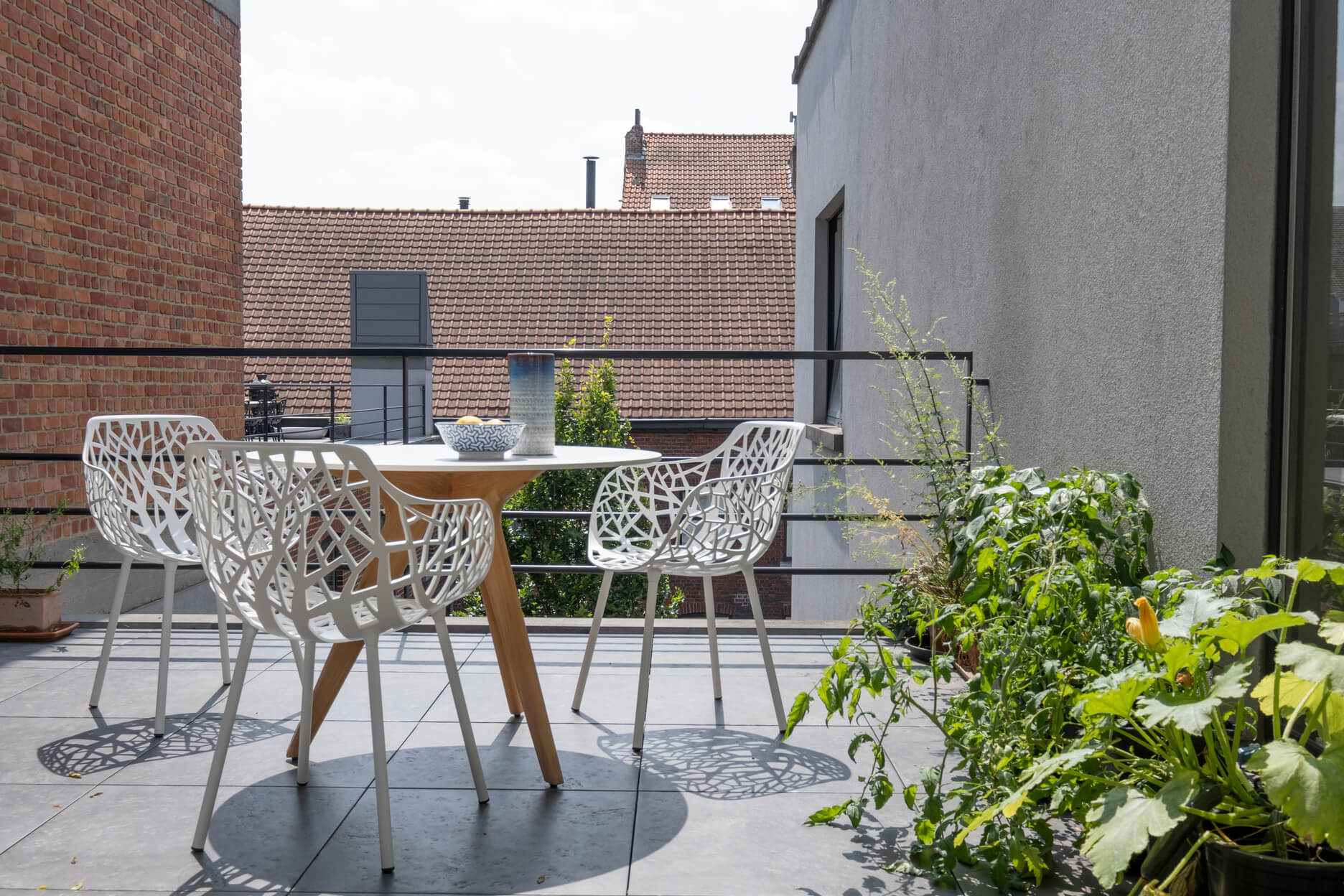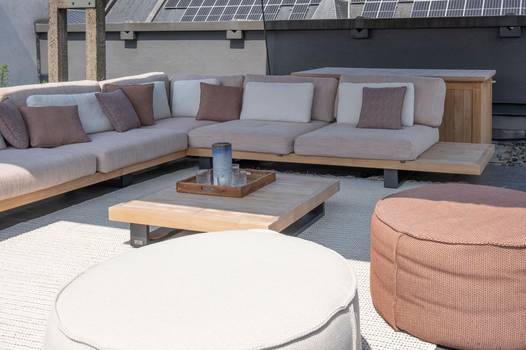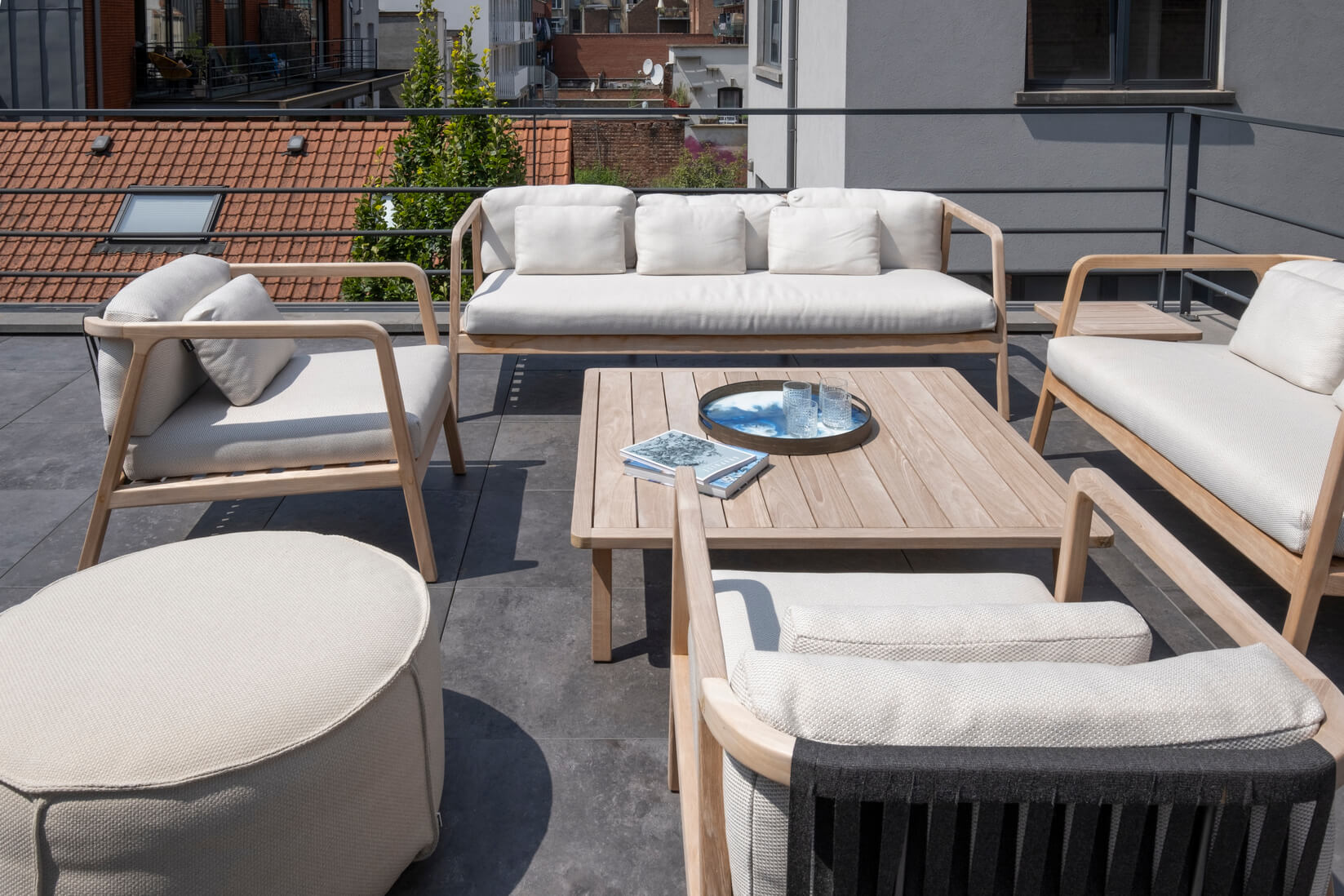 Voor dit project was het de bedoeling om het koude, industriële karakter van het gebouw tegen te gaan door teakhouten meubelen te gebruiken op de verschillende terrassen. We wilden een bohemien-chique sfeer creëren en comfort combineren met een ontspannen gevoel.