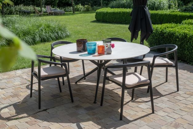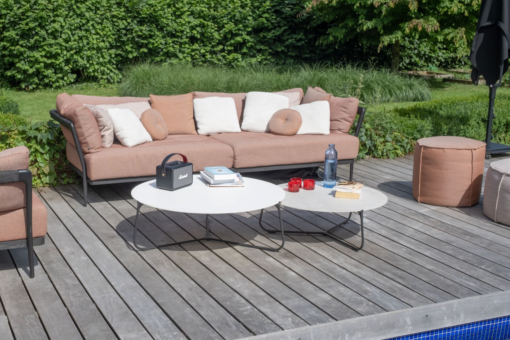 Rather than the classic deckchairs around the pool, we suggested that they opt for an outdoor lounge with a colourful fabric, more versatile and welcoming, echoing the shades of the bow window tiles and the colour of the window frames in the blackened teak used throughout the furniture.