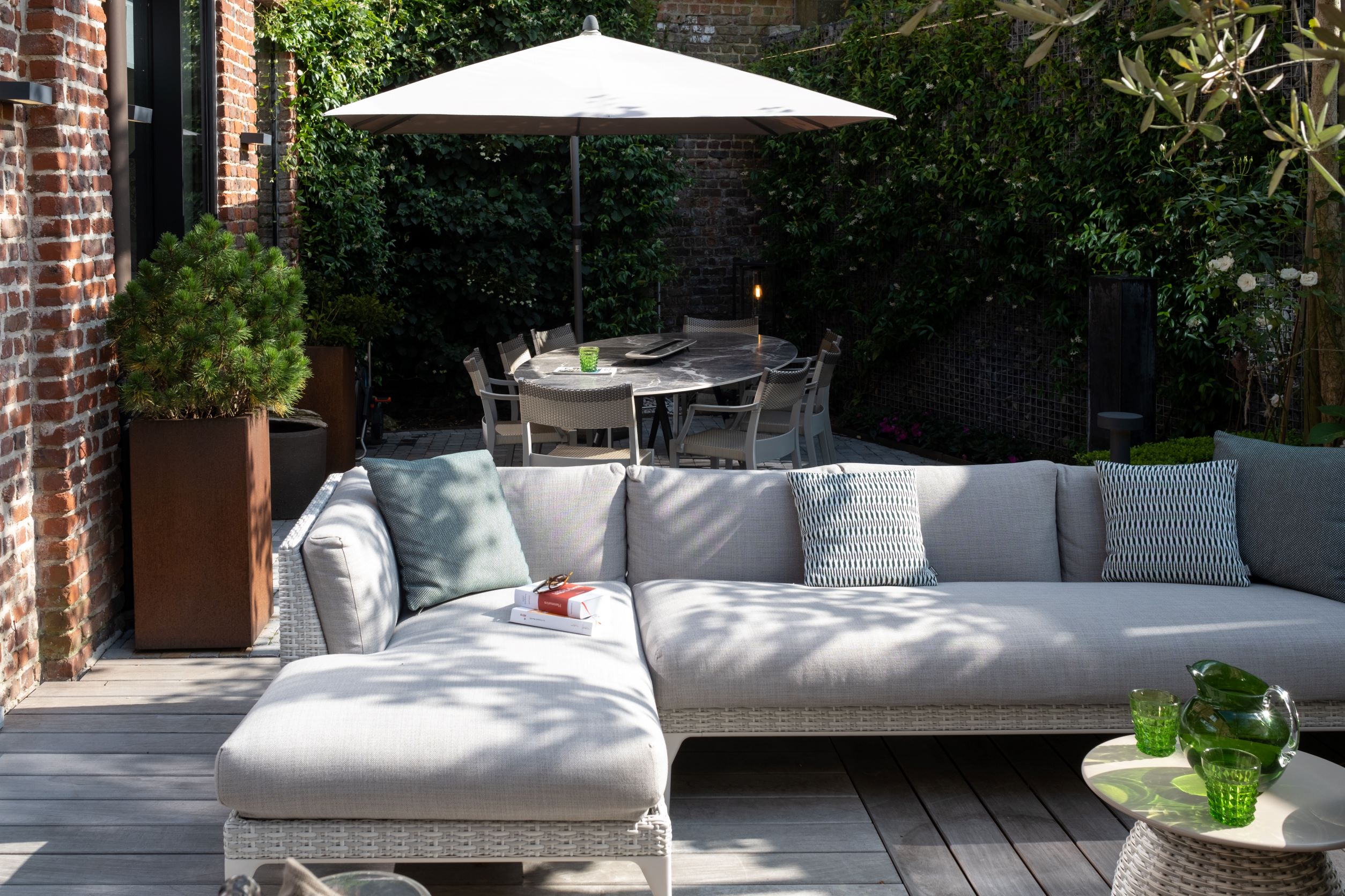 The idea was to create an intimate atmosphere while still being able to accommodate friends, so we suggested a large elliptical table seating 8, and 1 corner sofa that could be used as a chaise longue for reading or sunbathing, flanked by recliners and 1 rocking chair, ideal for a siesta in the shade of the superb potted olive tree.
