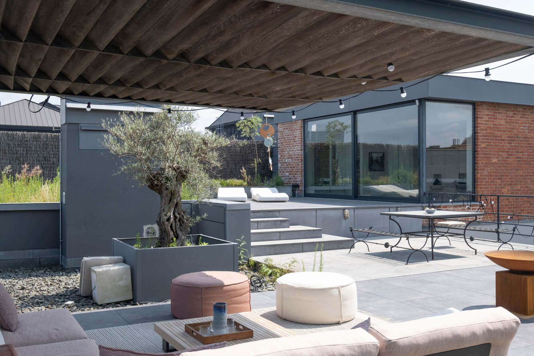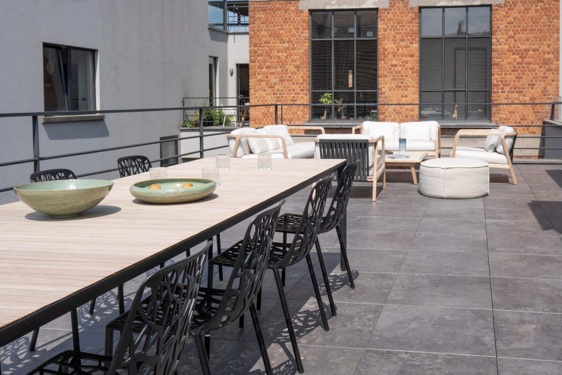 For this project, the aim was to counter the cold, industrial character of the building by using teak furniture on the various terraces. We wanted to bring in that bohemian-chic spirit, combining comfort with a relaxed feel.