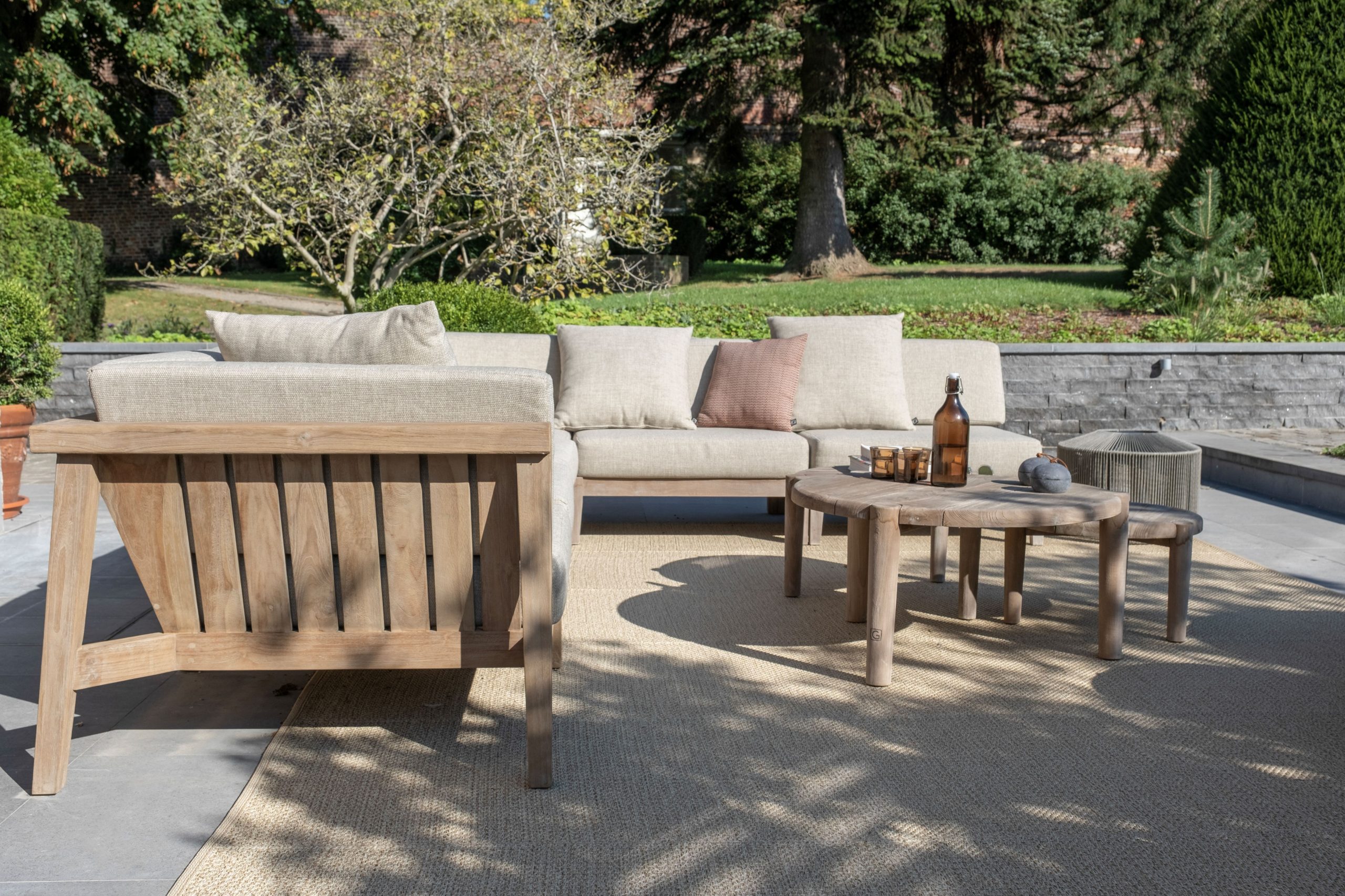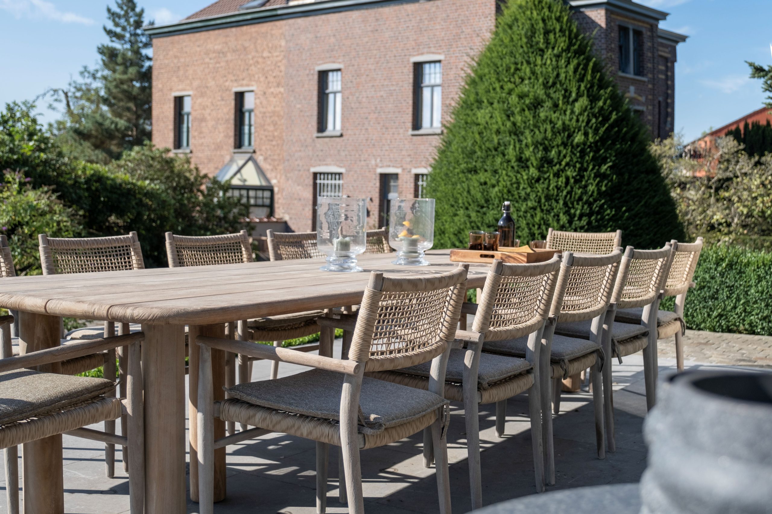 We therefore suggested that they work with the GOMMAIRE collection, in aged teak, to bring that sought-after warm touch. The terraces are spread over 2 separate areas in the property, connected to each other by a path. The living room is located in front of the main building, composed of a corner lounge, a set of nesting tables and completed with mobile round poufs echoing the color of the brick of the building. The summer dining room is located in front of a small annex which contains a spare kitchen and a bar, and is made up of a large table which can accommodate up to 12 guests, surrounded by teak and woven rope armchairs.